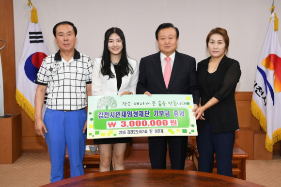 1일 김천시인재양성재단을 방문한 2016 김천포도아가씨 ‘진’ 이민제양과 부친인 옥토부동산 이점수 대표는 “김천 발전에 조금이나마 보탬이 되고 싶어 상금 중 일부인 3백만원을 장학금으로 기탁하게 됐다며, 이번 자매결연 도시에서의 농산물 판촉행사 참여와 더불어 앞으로도 김천포도아가씨로서 기회가 닿는 대로 김천 홍보를 위해 최선을 다 하겠다.”고 말했다.