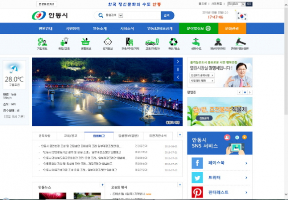 안동시 대표홈페이지는 시정전반에 대한 소식과 다양한 생활정보, 문화예술, 관광안내 등 수준 높은 콘텐츠로 시민들이 쉽게 접근하고 사용 할 수 있도록 서비스를 제공하고 있다.
