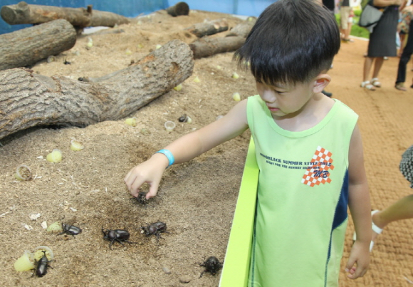 이어 어린이들이 가장 좋아하는 전시존 중 하나인 딱정벌레체험 존에서는 장수풍뎅이, 넓적사슴벌레, 장수풍뎅이 유충 등 일반인들에게 친숙한 애완곤충들을 직접 만져보고 체험할 수 있는 공간으로 꾸며졌다.