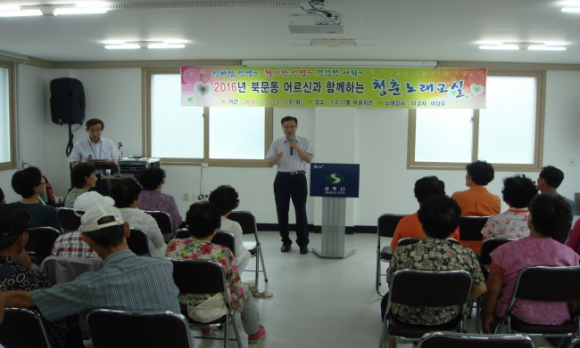 북문동(동장 임종목)에서는 8.2(화) 무양1,2,17통 경로당 2층에서 관내 기관․단체장, 지역 주민 등 50여명이 참석한 가운데 “2016년 북문동 어르신과 함께하는 신바람 청춘노래교실” 수료식을 가졌다.