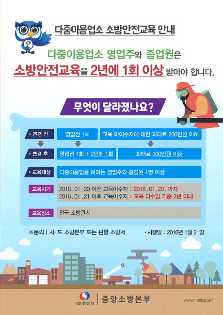 2016년 1월 21일 다중이용업소 안전관리에 관한 특별법 및 시행규칙이 개정되어 모든 다중이용업주 및 종업원은 2년마다 보수교육을 이수하여야 한다.