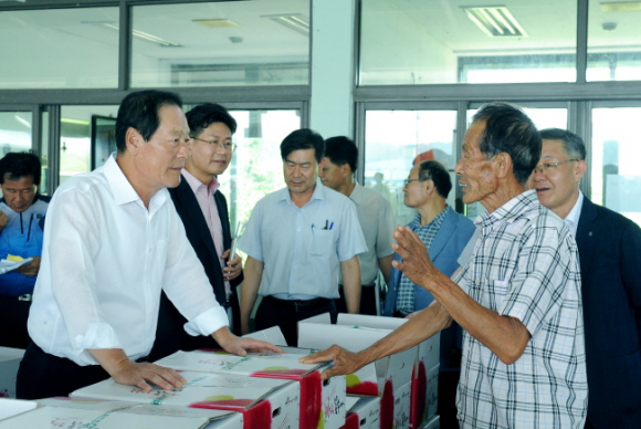 김영석 영천시장은 8월 4일 복숭아, 자두, 포도 등 과일 주출하시기를 맞이하여 어느 때보다 활기를 띠고 있는 영천농산물도매시장과 영천농협 및 능금농협에서 운영하는 농산물공판장(2개소)을 방문하여 경매 상황을 지켜보고 어려운 여건 속에서도 우리농산물을 지켜온 과일 생산 농가를 격려하고 희망과 용기를 북돋아 주었다.