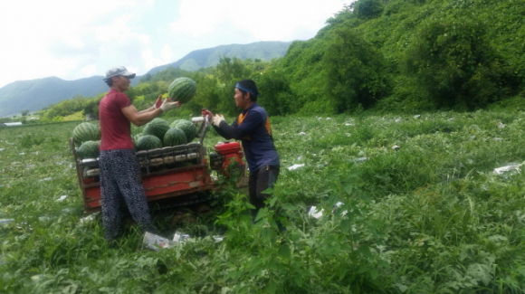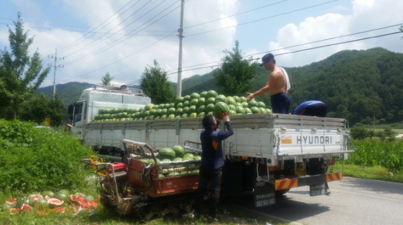 봉화군 재산에서는 천혜의 자연환경에서 생산된 재산수박이 하우스 수박 출하를 마치고 노지 수박 출하가 한창이다.