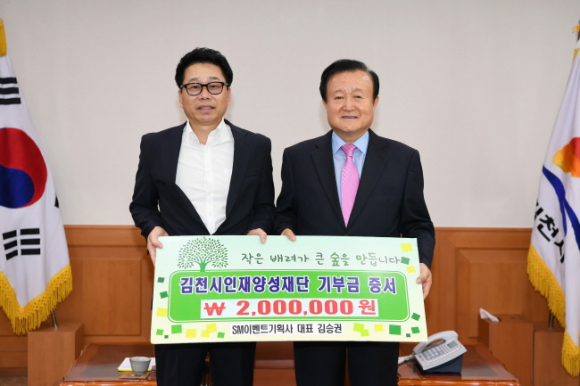 김천의 교육발전을 위해 SM이벤트기획사 김승권 대표가 지난 5일 김천시를 방문하여 김천시인재양성재단(이사장 박보생)에 장학기금 2백만원을 기탁했다.