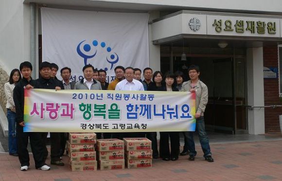 경상북도고령교육청(관리과) 직원 15명은 2010.3.23.(화) 고령 성산면에 위치한 성요셉재활원을 방문하여 위문품을 전달하고, 화단정리 및 대청소, 창고정리 등 1일 환경개선 도우미로서 봉사활동을 실시하였다.