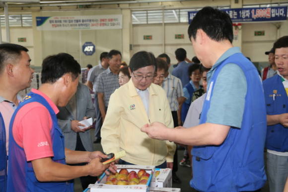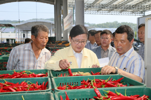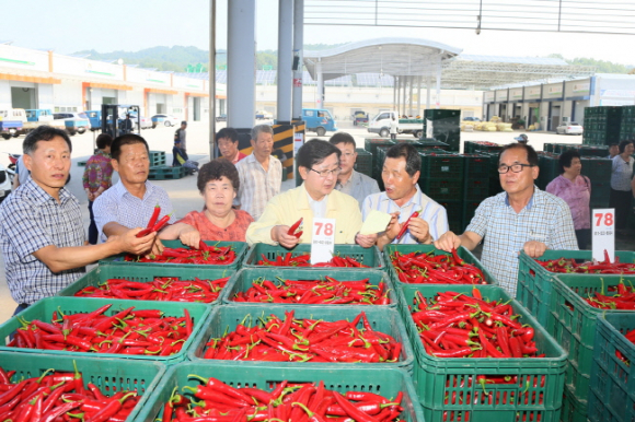 권영세 안동시장이 11일 안동시 풍산읍 노리에 소재한 고추유통센터와 농산물도매시장을 찾아 고추와 사과 등의 가격동향을 살피고 농민들의 애로사항도 들었다.