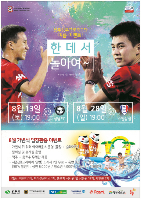 상주상무프로축구단(대표이사 백만흠)이 8월 13일(토) 저녁 7시에 열리는 성남FC전과 28일(일) 저녁 7시 수원과의 홈경기에서 무더위를 이기기 위한 여름 이벤트 ‘한데서 놀아여~’를 공개했다.