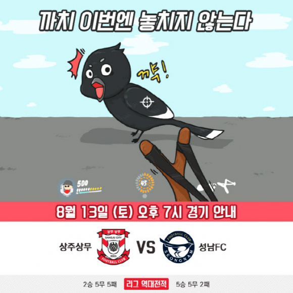 비록 서울전 패배로 성남에게 3위 자리를 내어주고 5위로 밀렸지만 승점 차이가 2점에 불과해 한 경기의 결과로 다시 순위를 뒤집을 수 있다. 상주는 오는 성남과의 경기를 통해 3위를 다시 되찾겠다는 의지로 시원한 공격축구를 선보일 예정이다. |