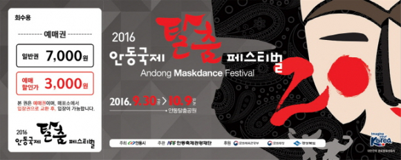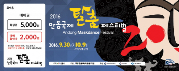 안동축제관광재단(이사장 권영세, 이경원)은 대한민국 글로벌 육성축제 안동국제탈춤페스티벌2016을 사전에 홍보하고 탈춤공연 관람의 편의를 제공하기 위해 입장권 예매를 시작한다. 입장권 예매행사는 8월 16일부터 9월 19일까지 약 한 달간 진행된다. 예매가격은 일반권 3,000원(정상가 7,000원), 학생권 2,000원(정상가 5,000원)이며 높은 할인율을 적용한 저렴한 가격으로 양질의 국내외 공연을 감상할 수 있는 기회를 제공할 예정이다. 예매권은 시청 민원실과 24개 읍면동 민원실을 비롯해 안동시내 대형은행, 서점, 커피숍 등 17개 지정예매처를 통해 구입할 수 있으며, 온라인 예매를 희망할 경우 옥션 티켓을 이용할 수 있다. 축제 20년을 맞아 오는 9월 30일부터 10월 9일까지 열흘간 개최되는 안동국제탈춤페스티벌2016에는 중국, 일본, 말레이시아, 인도네시아, 라트비아, 야쿠티아, 터키, 스리랑카, 인도, 필리핀, 불가리아 등 18개국 25개 단체의 외국탈춤과 국내 국가무형문화재 12개 탈춤 등이 참가하며 탈춤공연장에서 유료로 운영된다. |  | | | ⓒ GBN 경북방송 | |