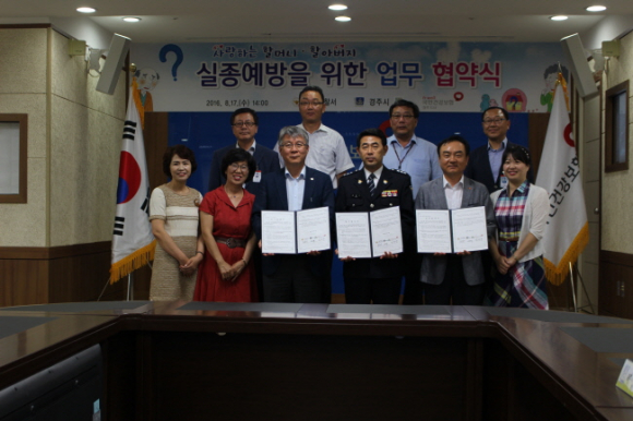 이날 협약식은 경주경찰서ㆍ경주시ㆍ국민건강보험공단 경주지사 등 치매질환자 관리와 실종예방 업무에 관련있는 기관들 간에 상호 업무 협력을 통하여 치매어르신들의 실종 사건을 예방하고 실종 사건 발생시 신속하게 발견하는데 뜻을 같이하고자 마련된 자리다.