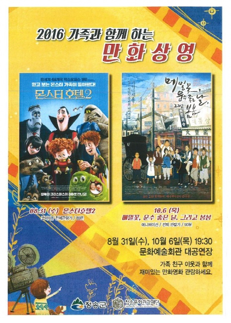 (재)청송문화관광재단은 오는 8월 31일(수)과 10월 6일(목) 오후 7시 30분 총 두 차례에 걸쳐 청송문화예술회관 대공연장에서 만화 영화 ‘몬스터호텔2’와 ‘메밀꽃, 운수 좋은 날, 그리고 봄봄’을 무료 상영한다.