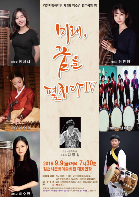 김천시문화예술회관(관장 장귀희)에서는 9월 9일(금) 오후 7시 30분『시립국악단 제4회 청소년 협주곡의 밤』을 대공연장 무대에 올린다. 차세대 국악 유망주들이 그동안 갈고닦아 온 저마다의 기량을 한껏 뽐내는 자리로 올해 네 번째 열린다.