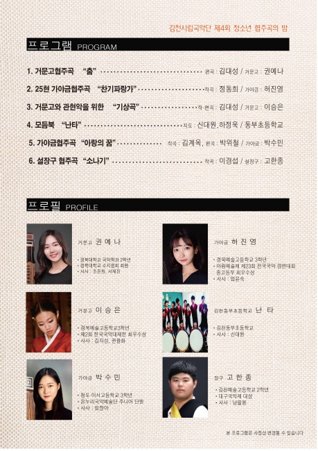 장귀희 김천시문화예술회관장은 ‘시립국악단과의 협연을 통해 차세대 국악을 이끌어 갈 청소년들에게 자긍심을 고취시키고 더 큰 성장을 위한 발판이 되는 기회를 제공하는 무대가 될 것이며 이들의 연주를 다 같이 감상하면서 격려의 큰 박수를 보내자’고 전했다.