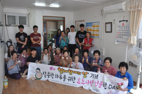 (사)영천시자원봉사센터(소장 최완우)는 영천시자원봉사센터 청소년 봉사단원들은 지난 27일 할매·할배의 날을 맞이하여 문화경로당을 방문하여 직접 만든 효도 사탕병을 어르신들께 전달했다.