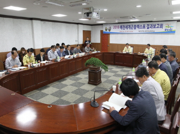 예천군에서는 31일 오후 2시 군청 영상회의실에서 2016예천세계곤충엑스포 추진결과와 개선방안에 대한 보고회를 가졌다.
