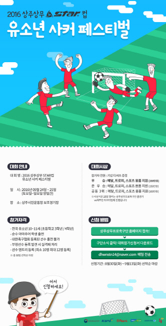 상주상무프로축구단(대표이사 백만흠)이 순수 아마추어 초등학생들을 위한 전국 축구대회를 개최한다. ‘2016 상주상무 STAR컵 유소년 사커 페스티벌’은 9월 24일부터 25일까지 양일간 상주시 시민운동장 보조경기장에서 진행된다.