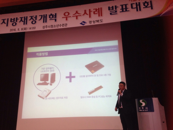 이번에 발표할 사례는 업무용 PC성능 저하 시 새로운 PC로 교체할 경우 100만원 이상의 예산이 소요되는 반면 SSD(10만원 상당)를 추가 설치할 경우 10분의 1의 경비로 체감 성능이 개선돼 예산절감 가능한 제안으로 경북도 뿐 아니라 전국적으로 파급효과가 클 것으로 보고 있다.