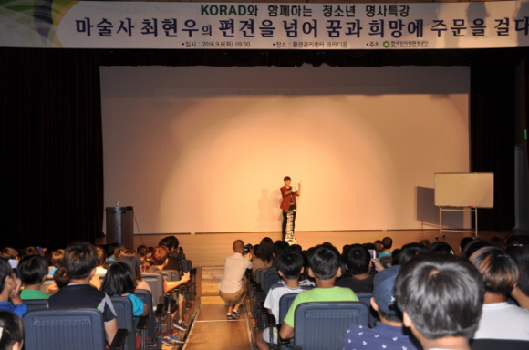 이에따라 공단은 6일 코라디움과 나산초등학교에서 두차례에 걸쳐 마술사 최현우 특강을 진행했다.