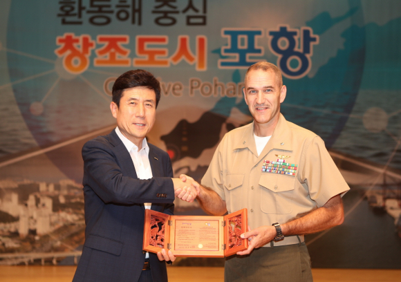 포항시는 6일 대잠홀에서 각종 봉사활동과 행사 참여로 시정 발전에 도움을 준 전 캠프무적 부대장 패트릭 에스 플레너리 중령에게 포항시 명예시민증을 수여했다고 밝혔다.
