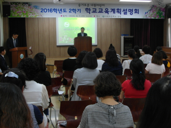 경주시 나원초등학교(교장 정재룡)는 9월 7일(수) 본교 강당에서 학부모와 교직원이 참석한 가운데 2016학년도 2학기 학교 교육 설명회를 개최하였다. 교장선생님의 학교경영계획을 학부모님께 소개하였으며 학부모님들도 학교교육발전을 위해 고민하고 동참해 주기를 부탁하였다. 그리고 학사일정과 학교교육과정, 정보통신윤리교육, 재난안전교육, 올바른 자녀훈육법, 사교육비 바로알기, 교원능력개발평가 등 다양한 내용으로 학부모를 위한 연수도 함께 이루어졌다.