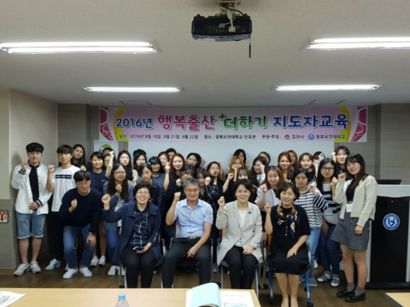 김천시(시장 박보생)는 2016년 출산장려 사업의 일환으로 경북보건대학교와 연계하여 김천시 관내 대학생 114명을 대상으로 2016년 9월 21일부터 9월 22일까지 3일간 대학생 행복출산 더하기 지도자 과정 교육을 실시했다.