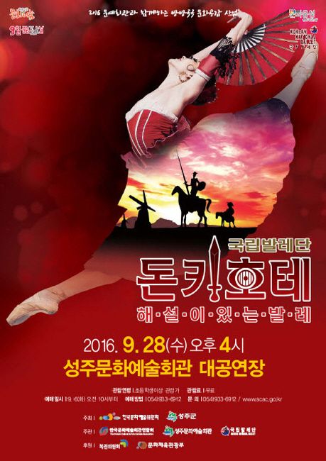 성주문화예술회관은 지역 청소년들의 교육적 문화예술 향유기회를 높이고 창조적인 인성육성에 기여하고자 국립발레단「해설이 있는 발레 돈키호테」를 9월 문화가 있는 날 28일(수) 오후 4시에 무료로 대공연장에서 공연한다.