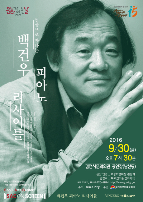 김천시문화예술회관(관장 장귀희)에서는 ‘SAC on Screen(공연영상화 사업)의 일환으로 서울 예술의 전당에서 공연한 『백건우 피아노 리사이틀』영상을 오는 9. 30(금) 오후 7시 30분 김천시립문화회관 공연장(남산동)에서 대형스크린을 통해 상영한다.