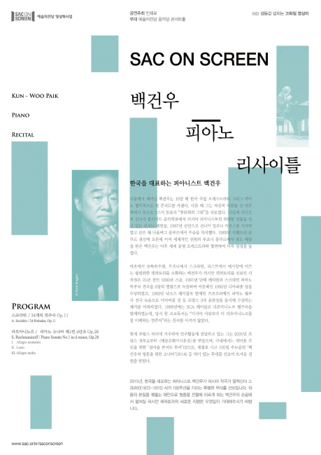 ‘SAC on Screen(공연영상화 사업)’은 지역간의 문화격차를 해소하기 위해 우수공연을 전국 문예회관에서 상영하는 영상화 사업으로, 이번 작품은 건반 위의 구도자이며 따뜻한 감성을 지닌 이 시대의 최고의 피아니스트 백건우 연주자가 러시아 작곡가 알렉산더 스크랴빈 서거 100주년을 기린 특별한 무대로 그의 24개 전주곡과 라흐마니노프 소나타 1번을 예술의 전당에서 연주해 뜨거운 갈채를 받은 공연이다.