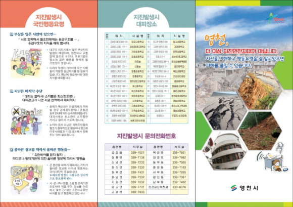 영천시는 지진 후 시민들의 불안한 마음을 해소하기 위해 영천시 홈페이지에 지진발생시 행동요령, 대피장소 및 피해접수 전화번호를 팝업창으로 게시하고 있으며, 인터넷을 잘 모르는 어르신들을 위해 홍보물을 제작하여 배부할 계획이다.