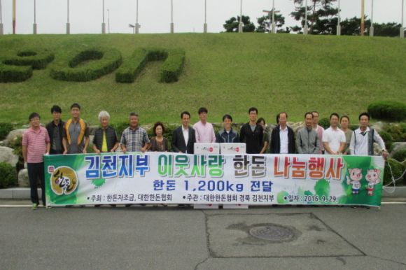 (사)대한한돈협회 김천시지부(지부장 정태주)는 9월 29일 ‘이웃사랑 한돈 나눔행사’의 일환으로 돼지고기 1,200kg(350만원 상당)을 김천시 관내 사회복지시설에 전달하여 지역사회의 귀감이 되고 있다.