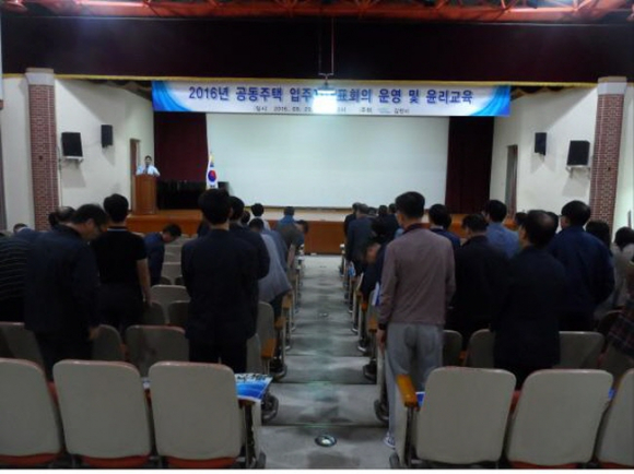 김천시는 9월 29일(목) 김천시 평생교육원 대강당에서 공동주택 입주자대표회의 구성원 및 관리사무소장 등 110여명이 참석한 가운데 「2016년 공동주택 입주자대표회의 운영 및 윤리교육」을 실시했다.