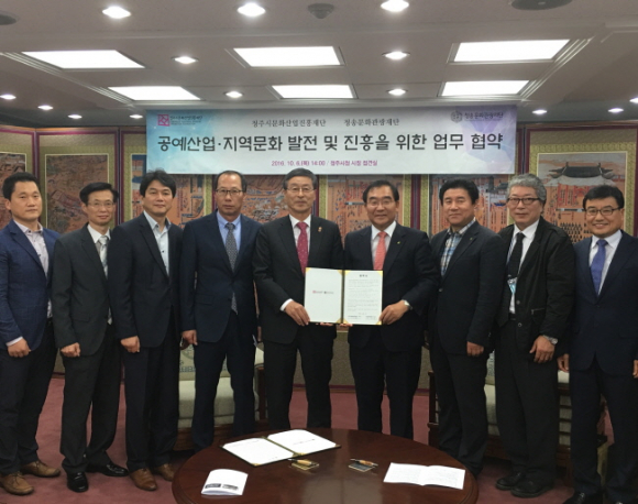 (재)청송문화관광재단(이사장 한동수)과 (재)청주문화산업진흥재단(이사장 이승훈)이 10월 6일(목) 오후 2시 청주시청 시장 접견실에서 공예산업 발전을 위한 업무협약식(MOU)를 체결했다.