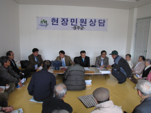 성주군은 찾아가는 행정 서비스 제공을 위해 ‘지적민원현장방문제’ 운영하고 있다. 지난 4월 7일에는 관내 금수면 광산2리 마을회관에서 인근 주민들에게 지적관련 토지분할, 합병, 지목변경과 지적측량, 새주소 변경 홍보, 개별공시지가 및 부동산 실거래가 신고등 기타 부동산 관련업무 전반에 걸쳐 상담 및 접수 처리와 각종 건의사항을 수렴하고 또한 군정 추진성과와 계획을 홍보 하였다.