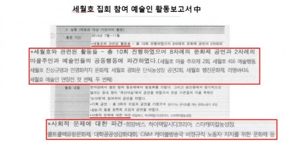 예술인복지재단 파견 예술인, 국비 지원받아가며 세월호, 밀양송전탑 건설반대 집회 등 참여!!