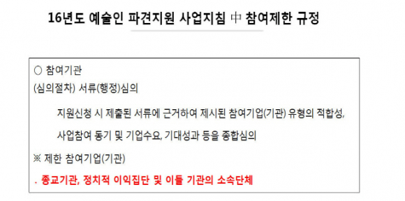 예술인파견 지원사업에 선정된 예술인이 세월호, 밀양송전탑 건설반대 집회 등에 수백만원의 국비를 지원받아 참여한 것으로 나타나 참여제한 등 관리가 강화되어야 한다는 주장이 제기되었다.