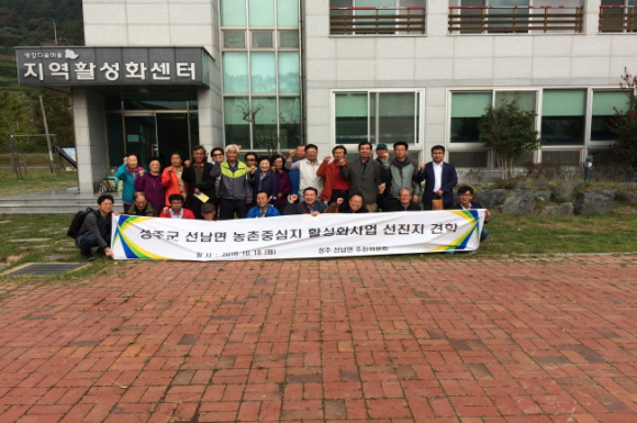 성주군은 2016. 10. 18(화) 2016년 일반농산어촌개발 신규사업으로 추진 중인 선남면 농촌중심지활성화사업의 원활한 기본 및 실시설계 계획을 수립을 위해,추진위원장 김진형 외 30명을 인솔하여 성주군 관계공무원과 함께 경남 남해군 앵강다숲마을, 거창군 가조면을 방문하여 선진지 견학을 실시했다.