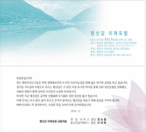‘맑은 물이 흐르고 은어가 돌아오는 형산강’을 주제로 열리는 이번 형산강 미래포럼은 동국대학교 경주캠퍼스와 형산강미래포럼이 주최하고 한동대학교 LINC사업단이 후원하는 행사이다.
