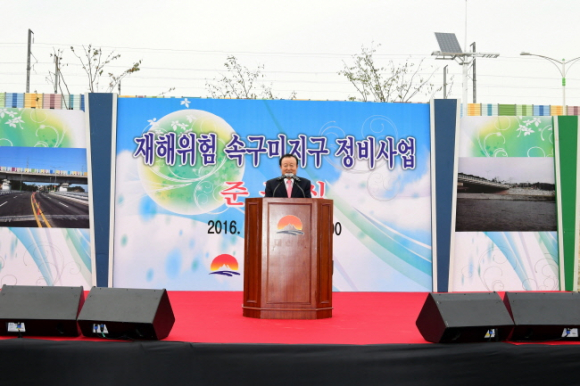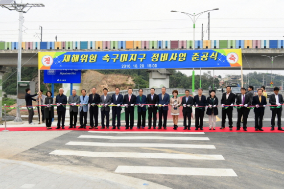 김천시(시장 박보생)는 10월 20일 모암동 경부고속도로 김천교 밑 가축시장 옆에서 지역주민 300여명이 참석한 가운데 재해위험 속구미지구 정비사업 준공식을 가졌다.