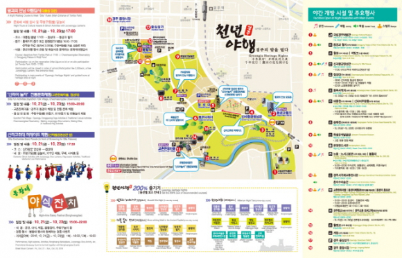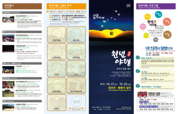 경주시와 경주문화원이 주최 주관하고 문화재청과 경상북도가 후원하는 천년야행은 오는 10월 21일부터 23일까지 3일간 첨성대와 봉황대 일원에서 펼쳐지며 지역 내 문화유산과 그 주변의 문화 컨텐츠를 하나로 묶어 깊어가는 가을밤에 다양하고 특화된 문화체험 기회를 관광객에게 제공한다.