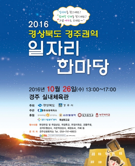 경주실내체육관에서 26일 오후 1시부터 구직자와 구인기업들을 위해 ‘2016 경북도 경주권역 일자리 한마당’ 행사가 열린다.