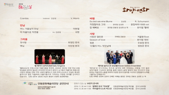 깊어가는 가을, 바쁜 일상의 연속으로 가을을 느끼지 못하는 현대인의 저녁시간에 만남, 그리움, 바람, 사랑이라는 테마로 진행하는 이번 공연에는 해설과 함께 다양한 가을 이야기도 펼쳐진다. 이번 공연의 자세한 내용은 전화 840-3600번 또는 안동문화예술의전당 홈페이지(http://www.andongart.go.kr)로 확인할 수 있으며, 이번 공연은 무료로 진행한다. |