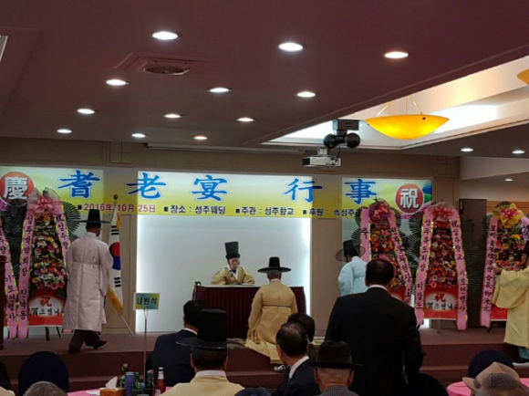성주향교(전교 송정근)는 지난 10월 25일 화요일 오전 11시 성주웨딩에서 지역 어르신들 200여분을 모시고 기관단체장, 향교 유림들과 함께 기로연 행사를 개최했다.