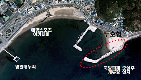 포항시가 해양레저스포츠의 활성화를 위하여 영일대해수욕장 인근 두호어항 유휴부지를 활용한 소형크루즈 및 해양레저 선박이 정박할 수 있는 선착장 조성공사를 추진한다.