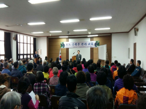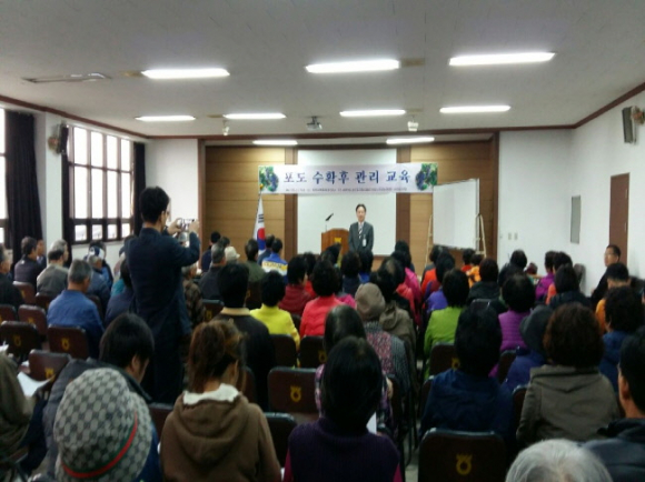 이날 교육에는 장세철 화동면장을 비롯한 200명이 넘는 많은 포도 재배농가들이 참석하였다. 수확 후 과수원 관리 교육 강사로 충북 옥천 농업기술센터 이석호 박사께서 열띤 포도 기술강의를 하였다.