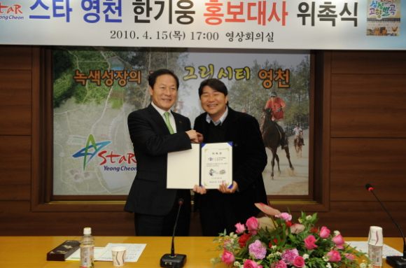 김영석 시장은 영천시 홍보대사로 위촉된 한기웅씨에게 위촉장을 수여하면서 “대한민국 동남권의 중심도시로 역동적인 발전을 거듭하고 있는 영천시의 발전상을 널리 알려 도시 홍보와 브랜드 가치를 높여주고, 앞으로 영천시를 위해 다양하고 적극적인 홍보활동을 펼쳐 줄 것”을 당부했다.