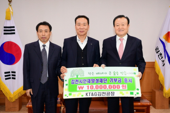 지난 3일 접견실에서 KT&G김천공장 이곤수 공장장 및 직원들은 “지역의 우수한 인재양성에 보탬이 되고자 전 직원이 매월 급여 중 일부를 상상펀드에 적립해 모은 돈으로 김천시인재양성재단에 장학기금 일천만원을 기탁하게 됐다.”고 말했다.