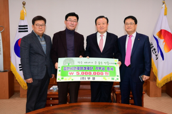 김천의 교육발전과 글로벌 인재육성을 위해 (주)부영(회장 김현석)에서 김천시인재양성재단(이사장 박보생)에 장학기금 오백만원을 기탁했다.