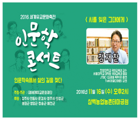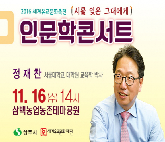 상주시(시장 이정백)에서는 세계유교문화재단(대표이사 황재천)주관으로 다가오는 11월 16일 오후 2시부터 상주 삼백농업농촌테마공원 홍보영상관에서 「2016 세계유교문화축전 인문학 콘서트」를 가진다.