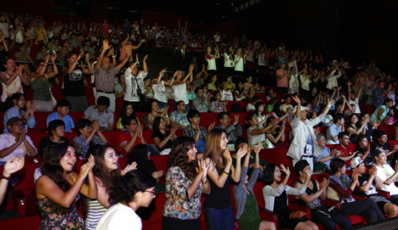 극장 문이 열리자 사람들이 쏟아져나오고 피부에서 붉은빛이 번져