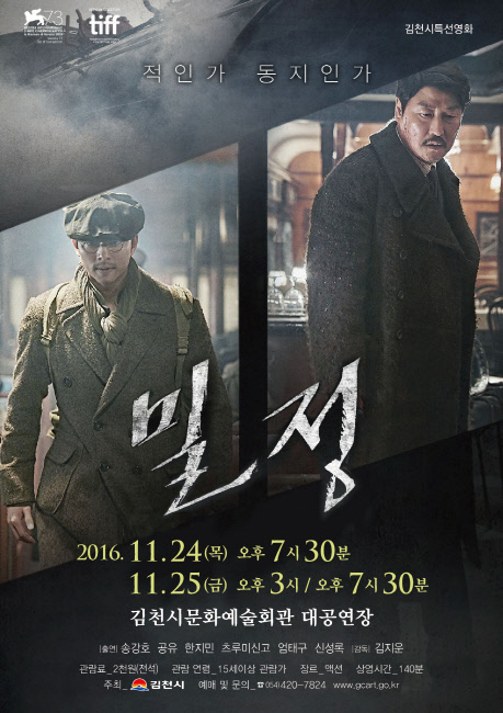 김천시문화예술회관(관장 장귀희)에서는 시민들의 건전한 여가문화 활성화를 위하여 특선영화『밀정』을 오는 11. 24(목) 오후 7시 30분, 11. 25(금) 오후 3시, 오후 7시 30분 3회에 걸쳐 문화예술회관 대공연장에서 상영한다.